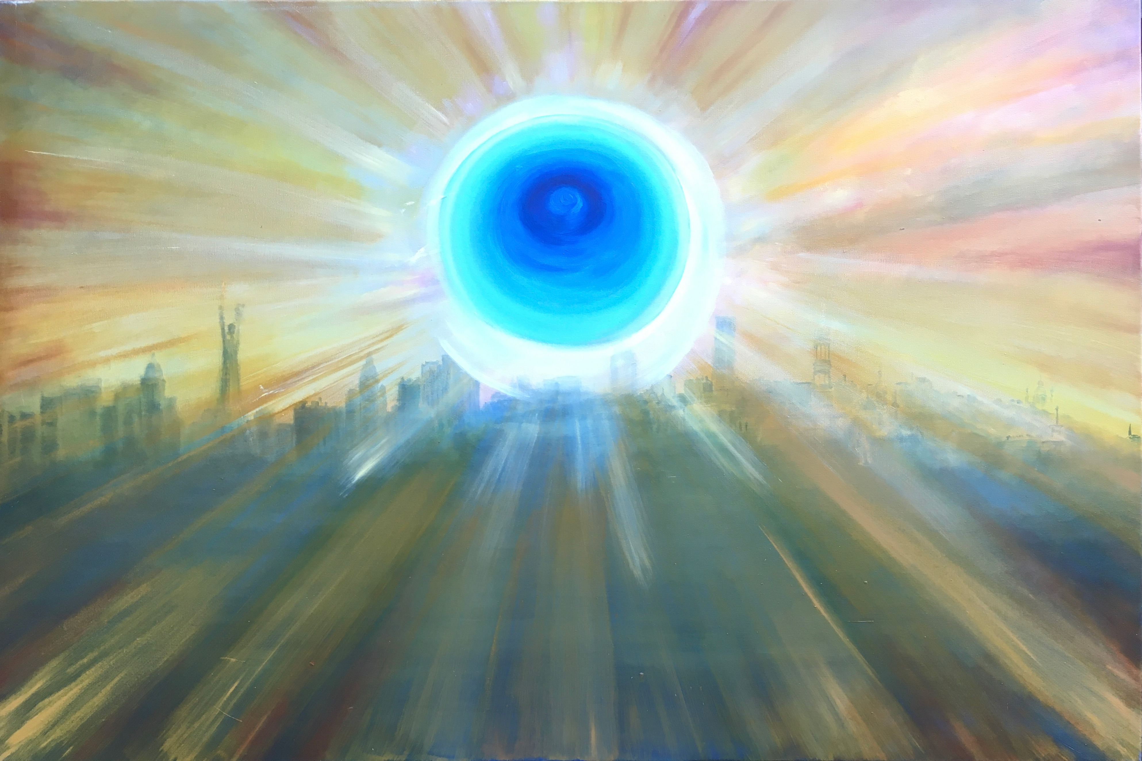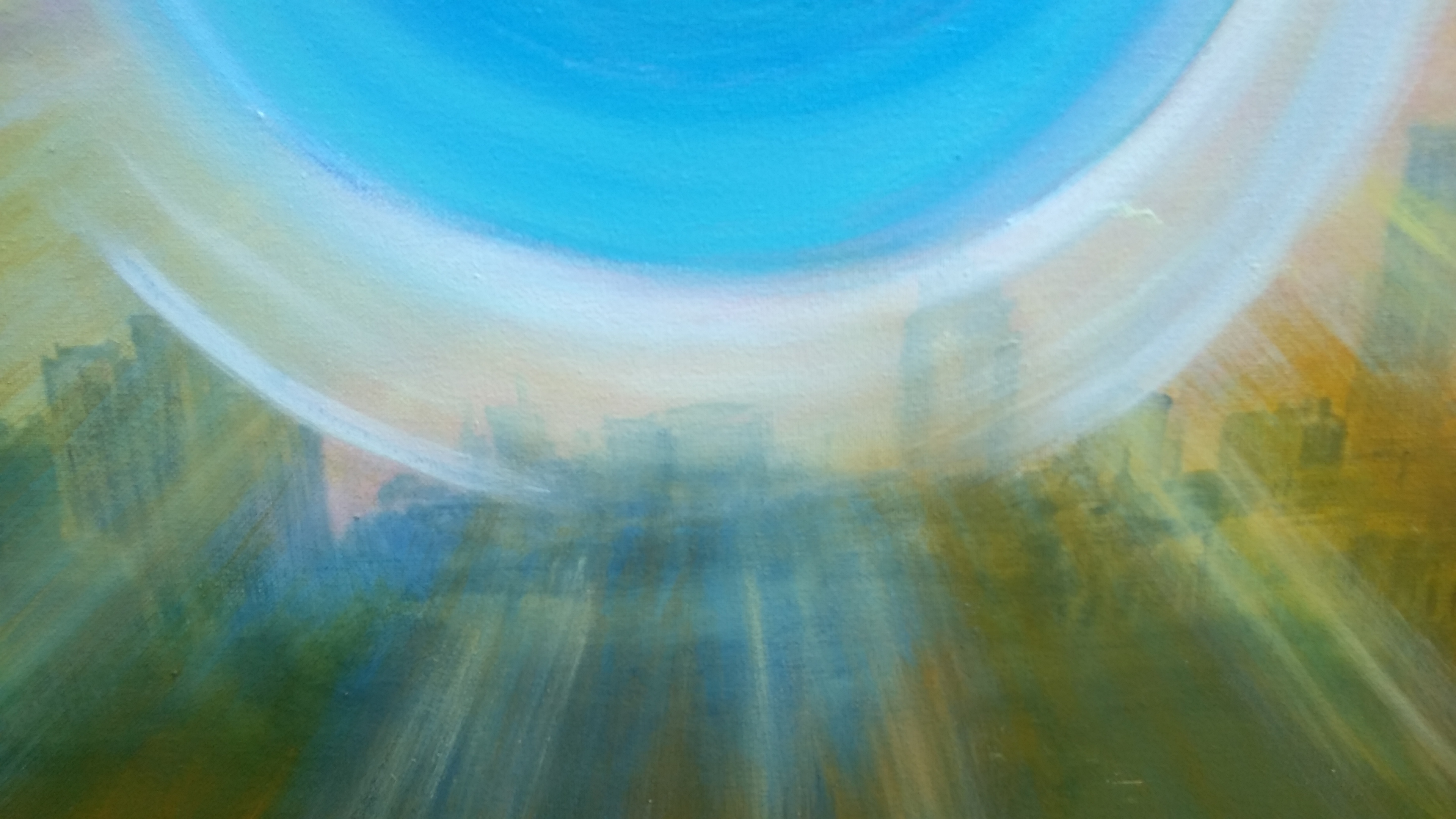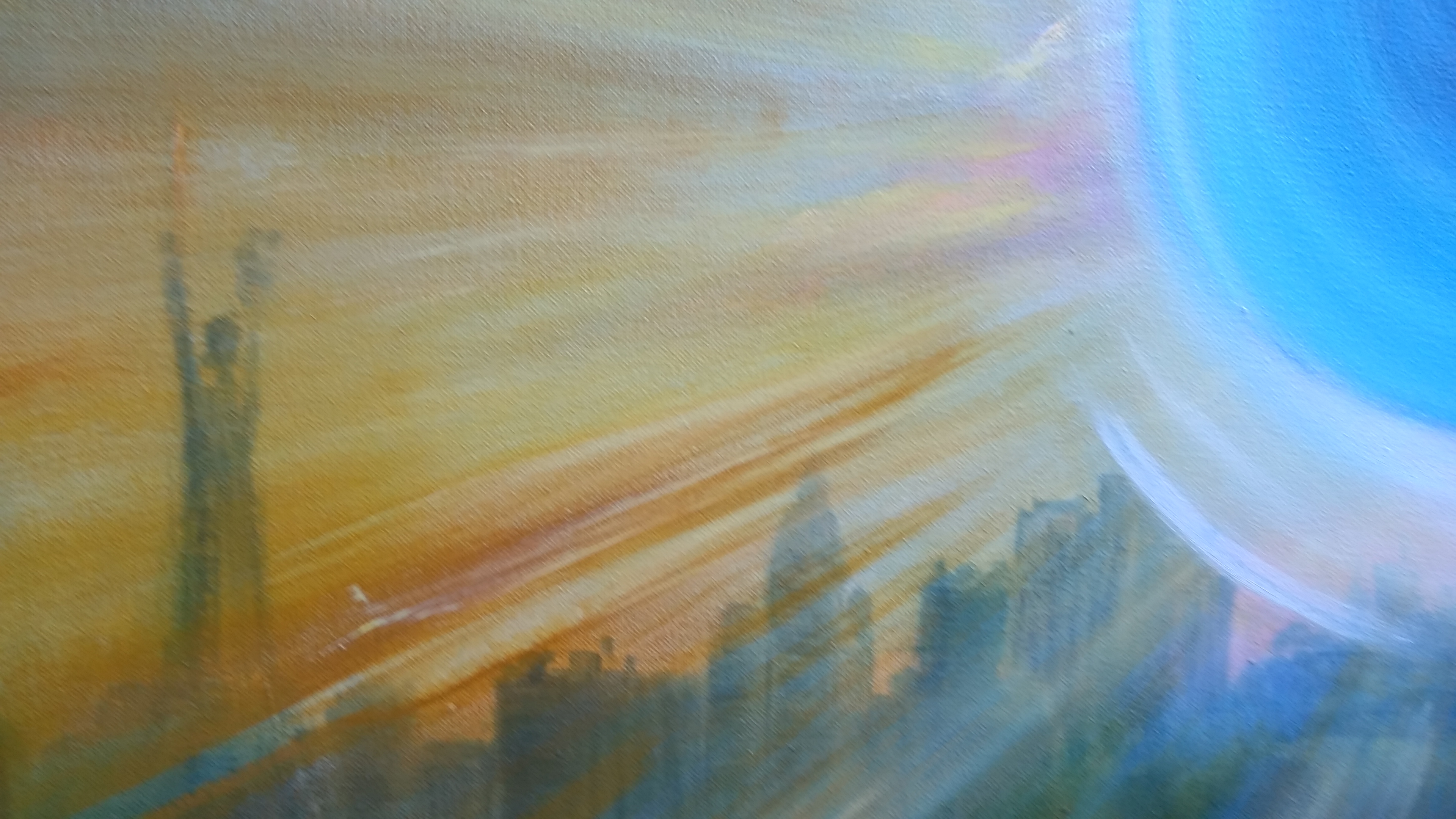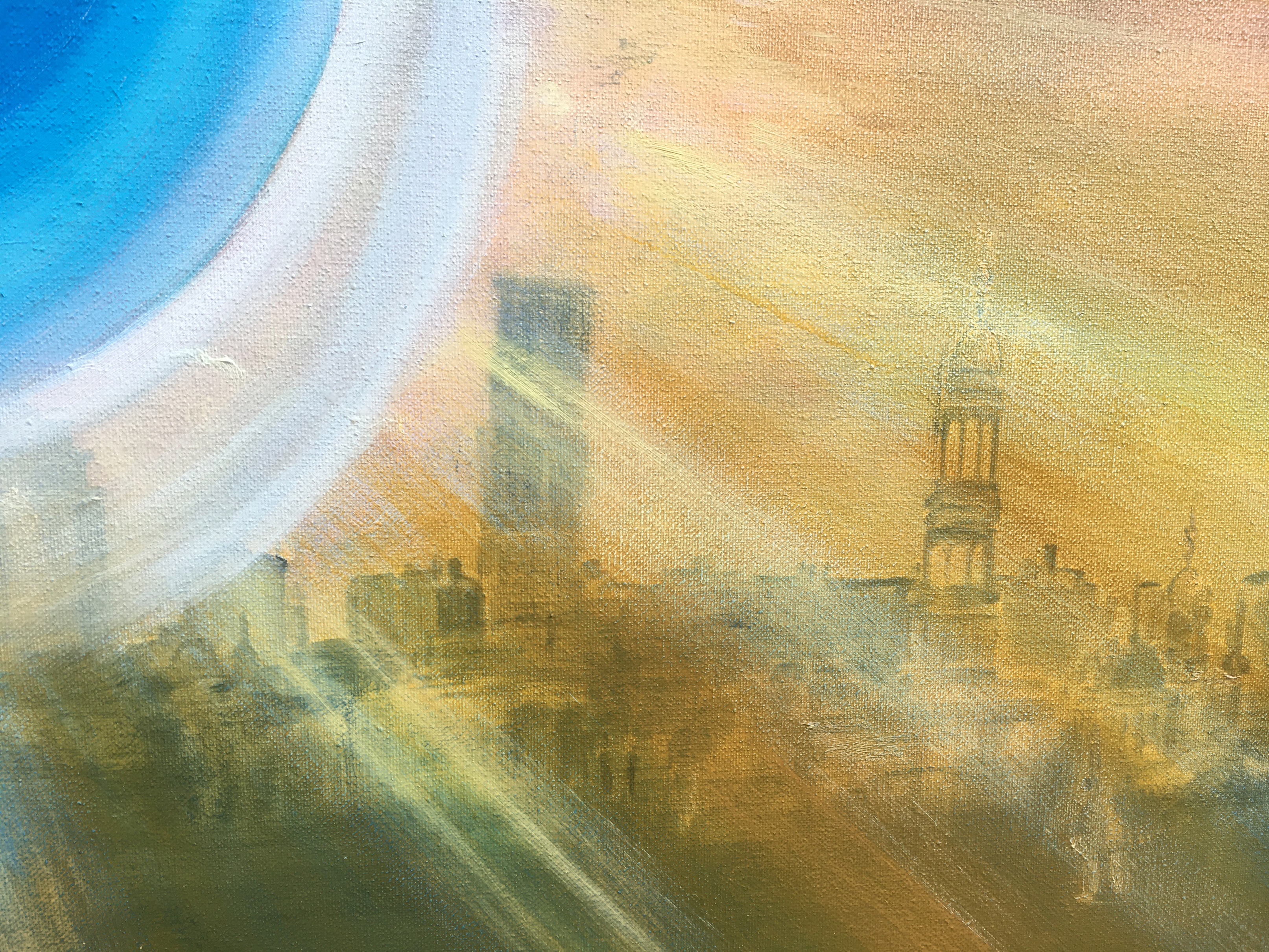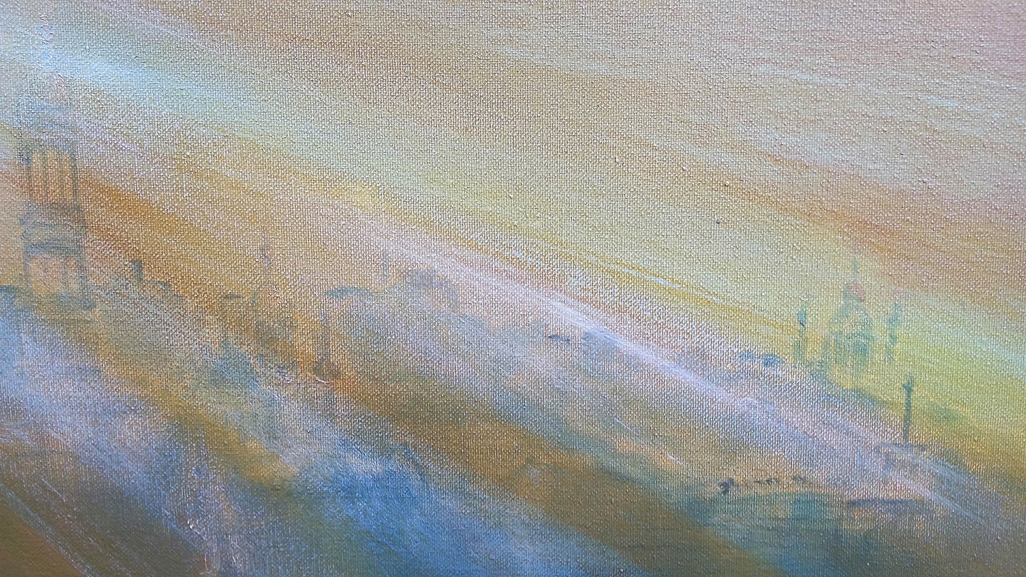 And, due to the fact that the work on the canvas began with the beginning of the world lockdown, I had to rewrite the sky several times, because in painting I cannot lie, and I cannot leave traces on the canvas that resemble a city burning from missile strikes.