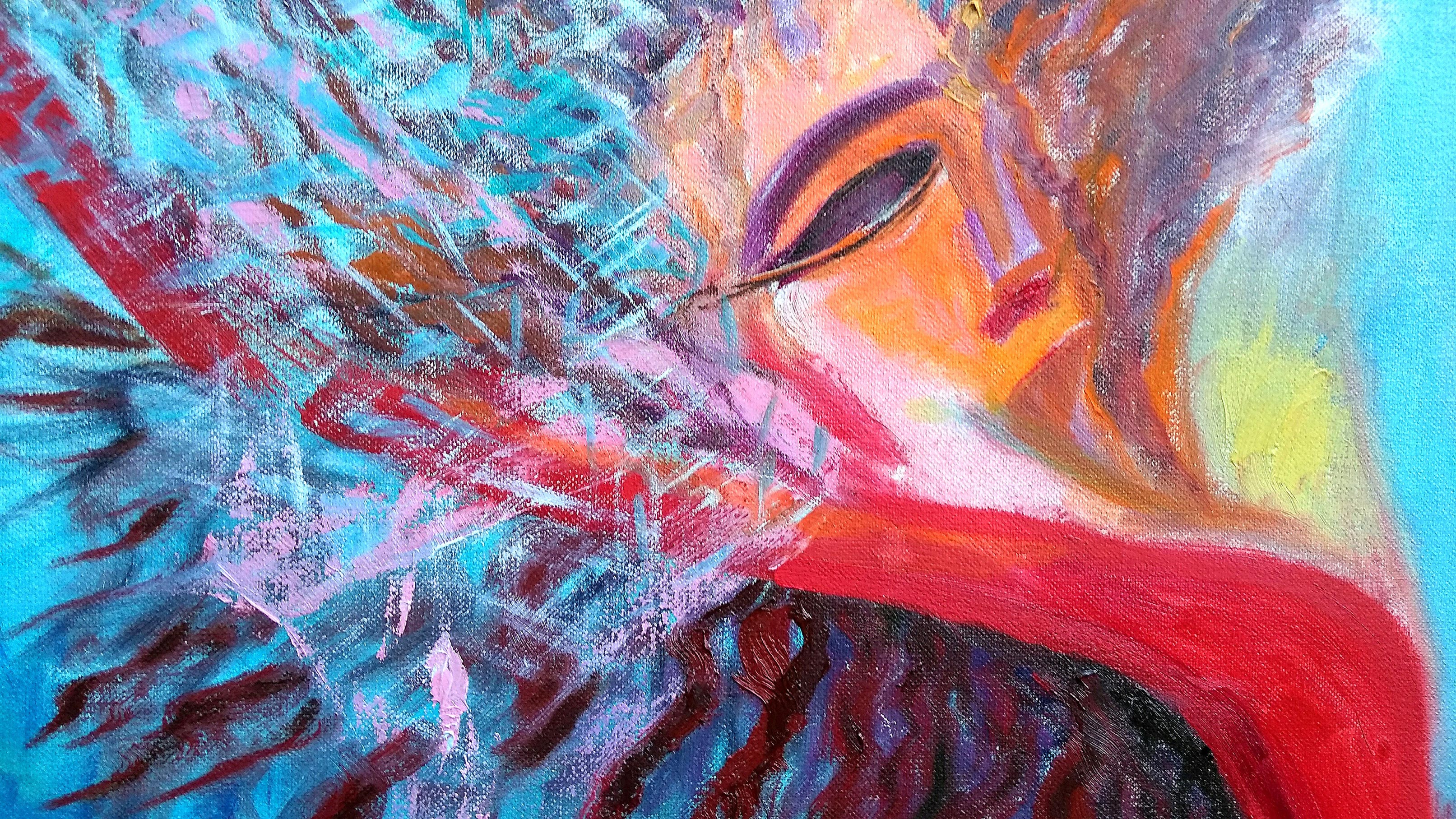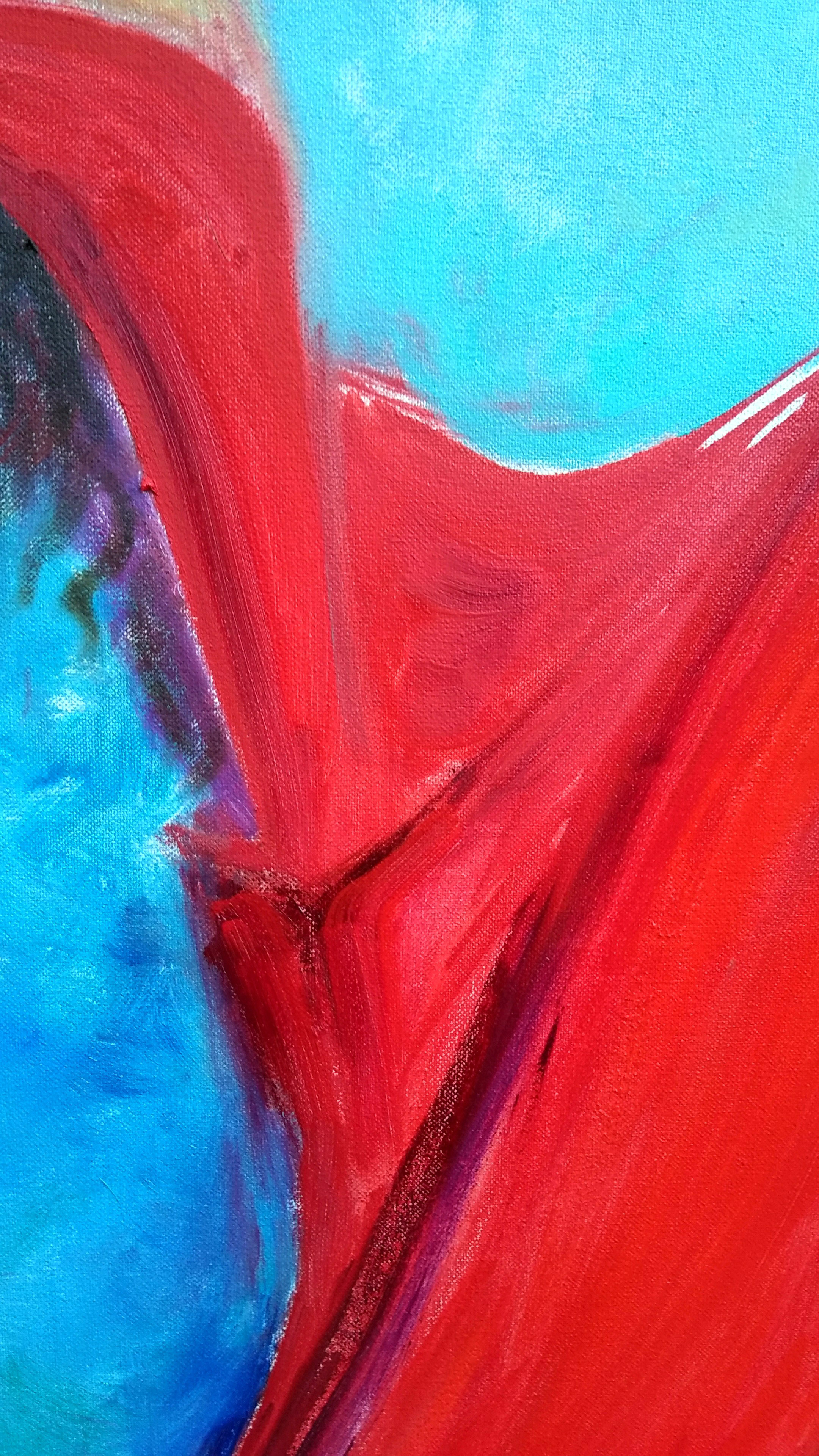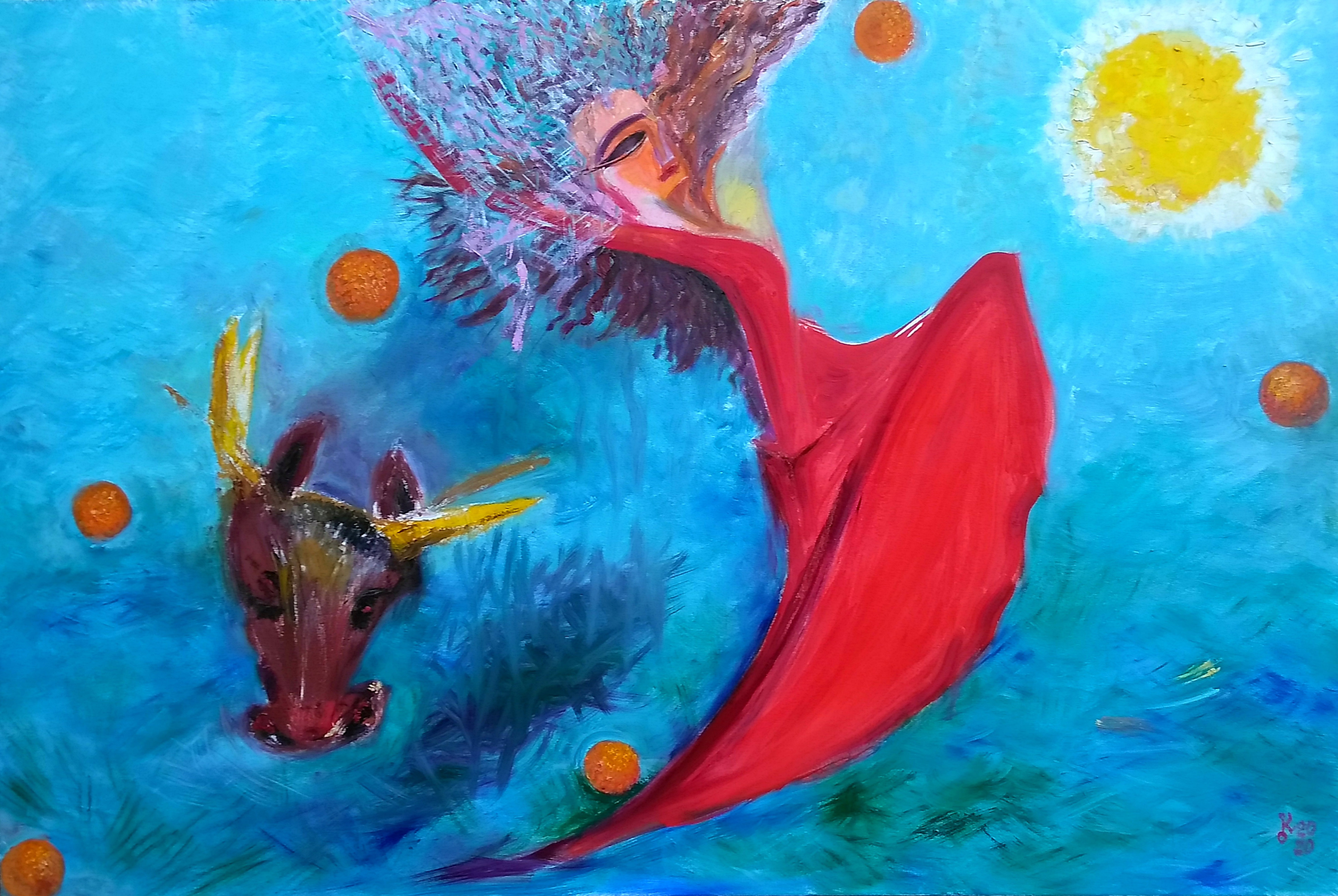 Woman dances flamenco, and the whole space around is subordinated to this rhythm. Even the bull bowed its head in front of her. The grass under the Spanish sky belongs to whoever stands on it! Or maybe it is the bull that kidnaps the dancer? The shimmering turquoise background - whether the sea or the sky - hides the answer.