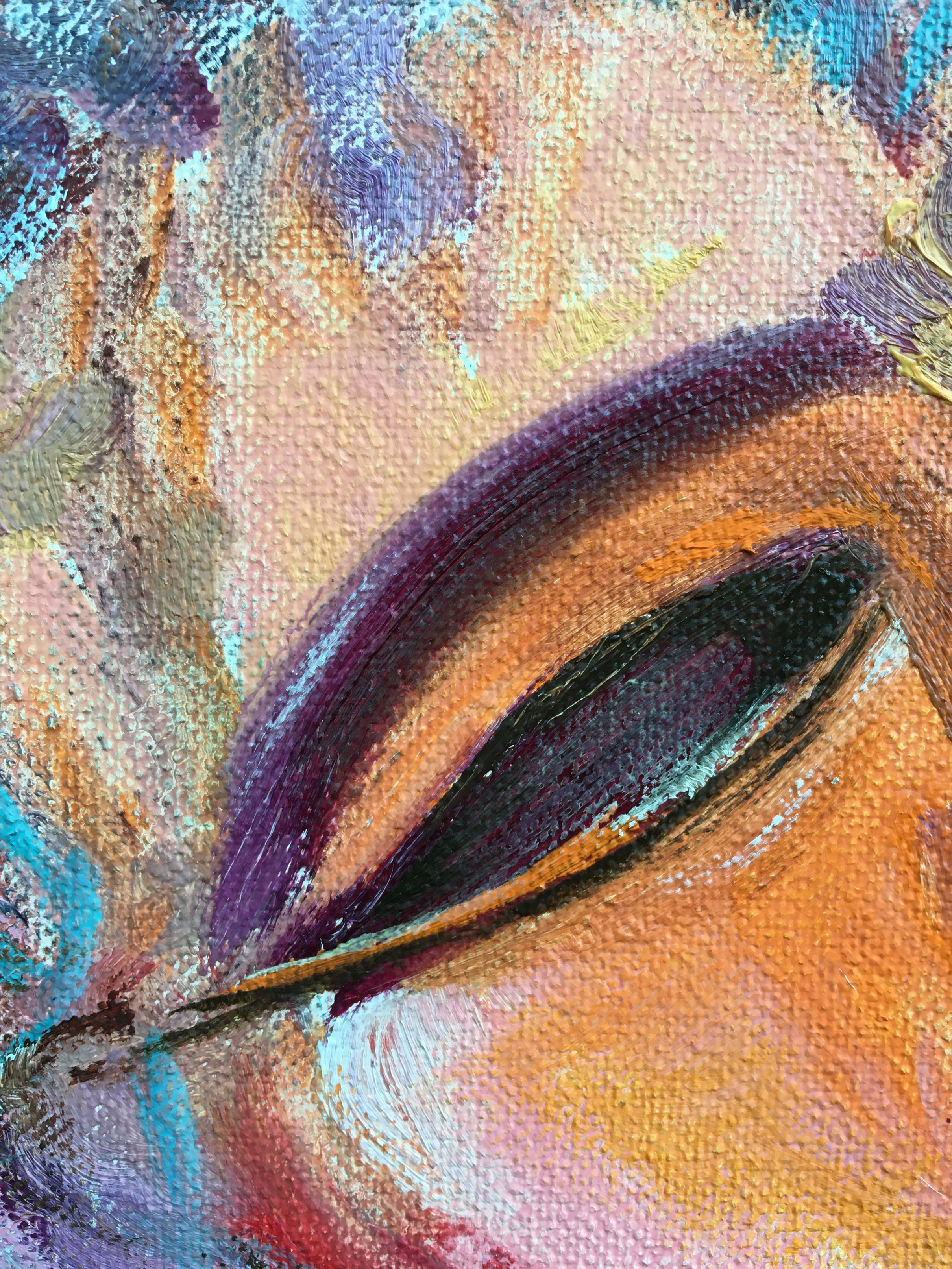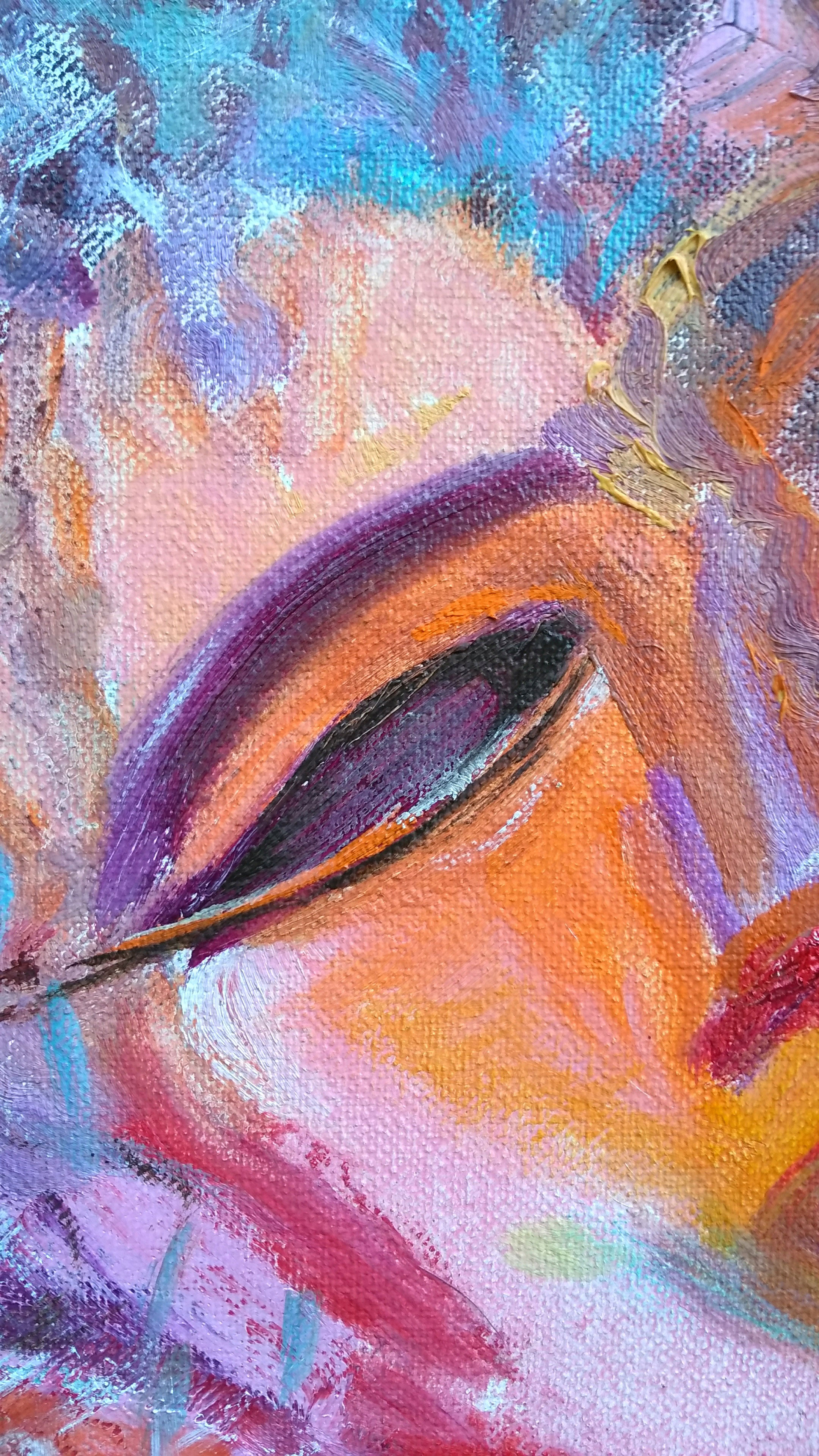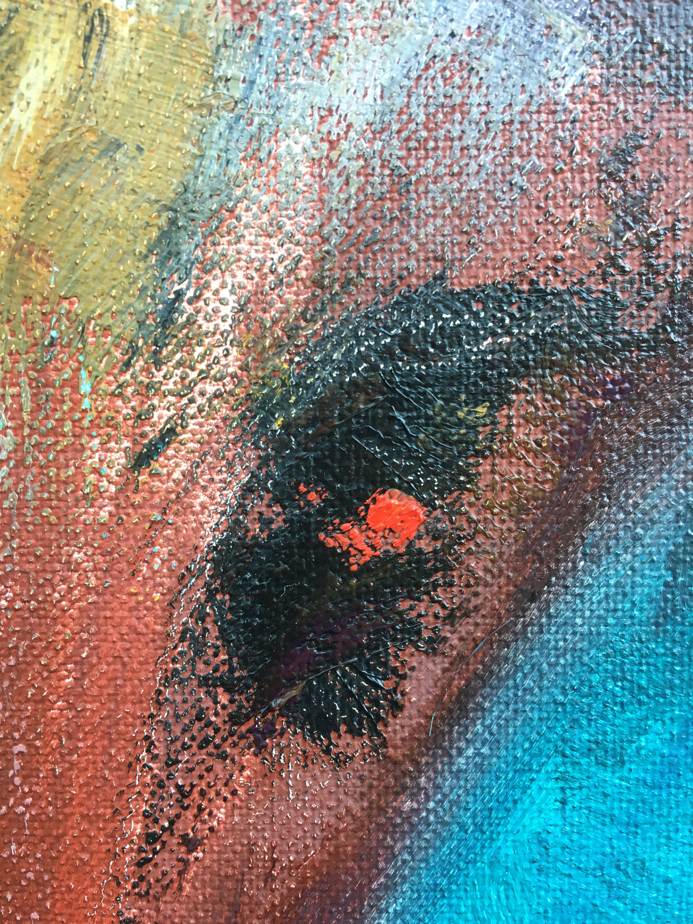 Woman dances flamenco, and the whole space around is subordinated to this rhythm. Even the bull bowed its head in front of her. The grass under the Spanish sky belongs to whoever stands on it! Or maybe it is the bull that kidnaps the dancer? The shimmering turquoise background - whether the sea or the sky - hides the answer.